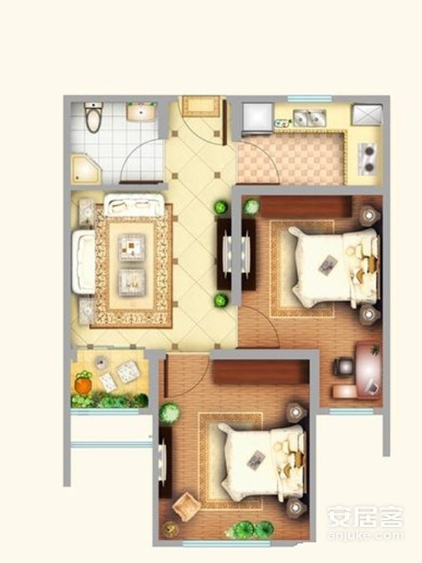 D戶型, 2室2廳1衛(wèi), 建筑面積約64.20平米